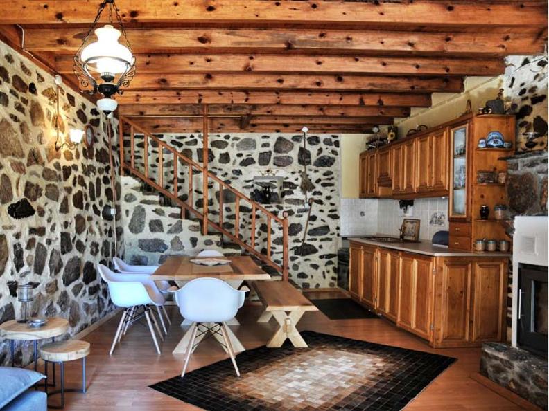 Split- Level Villa. This stone-built villa is traditionally decorated with wooden furnishing and beamed ceilings. It includes: -free Wi-Fi. -a living room with a fireplace and flat-screen TV. -a laptop. -a kitchen with a stove, fridge, dishwasher and dining table.